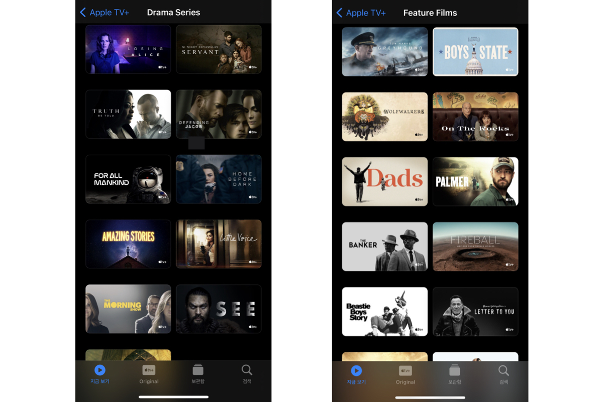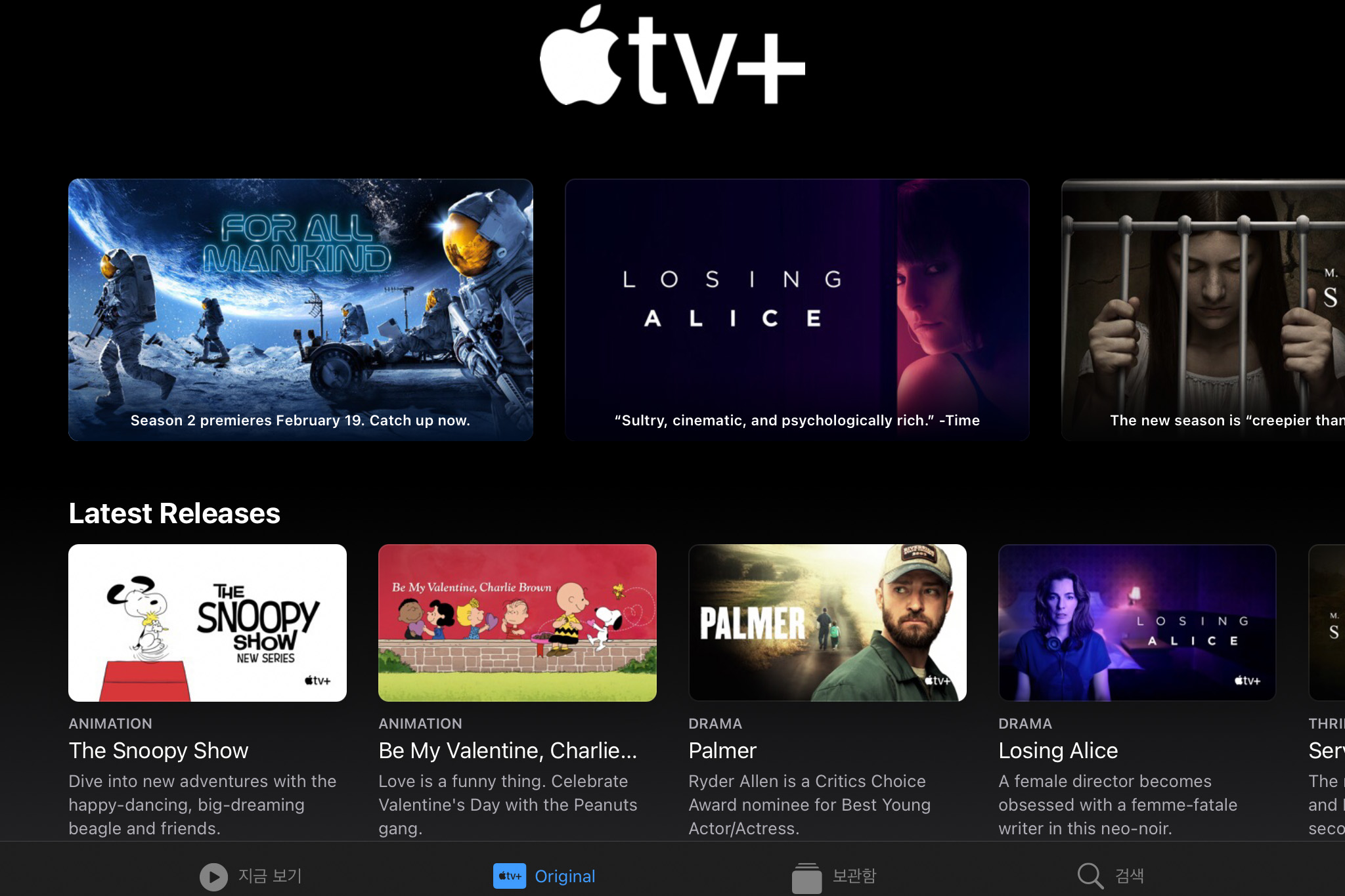 단순히 모아보기만 해주느냐? 그건 아닙니다. 애플티비 플러스라는 프리미엄 서비스를 구독하면 애플이 자체 제작한 애플티비 오리지날 콘텐츠를 볼 수 있습니다. 구독료는 4.99달러이며, 구독 시 추가금 없이 가족 공유가 가능합니다. 가격 대비 오리지날 콘텐츠가 부족한 편이지만, 4.99달러로 최대 6인이 즐길 수 있는 건 장점이죠. 단, 아직 국내 론칭이 안되었기에 애플 미국 계정으로만 이용할 수 있습니다.