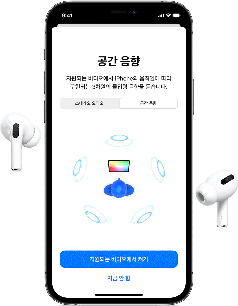 애플티비 플러스의 또 다른 매력은 에어팟 프로의 공간 음향을 마음껏 즐길 수 있다는 것이죠. 공간 음향은 에어팟 프로에서만 제공하는 입체 음향 기술입니다.