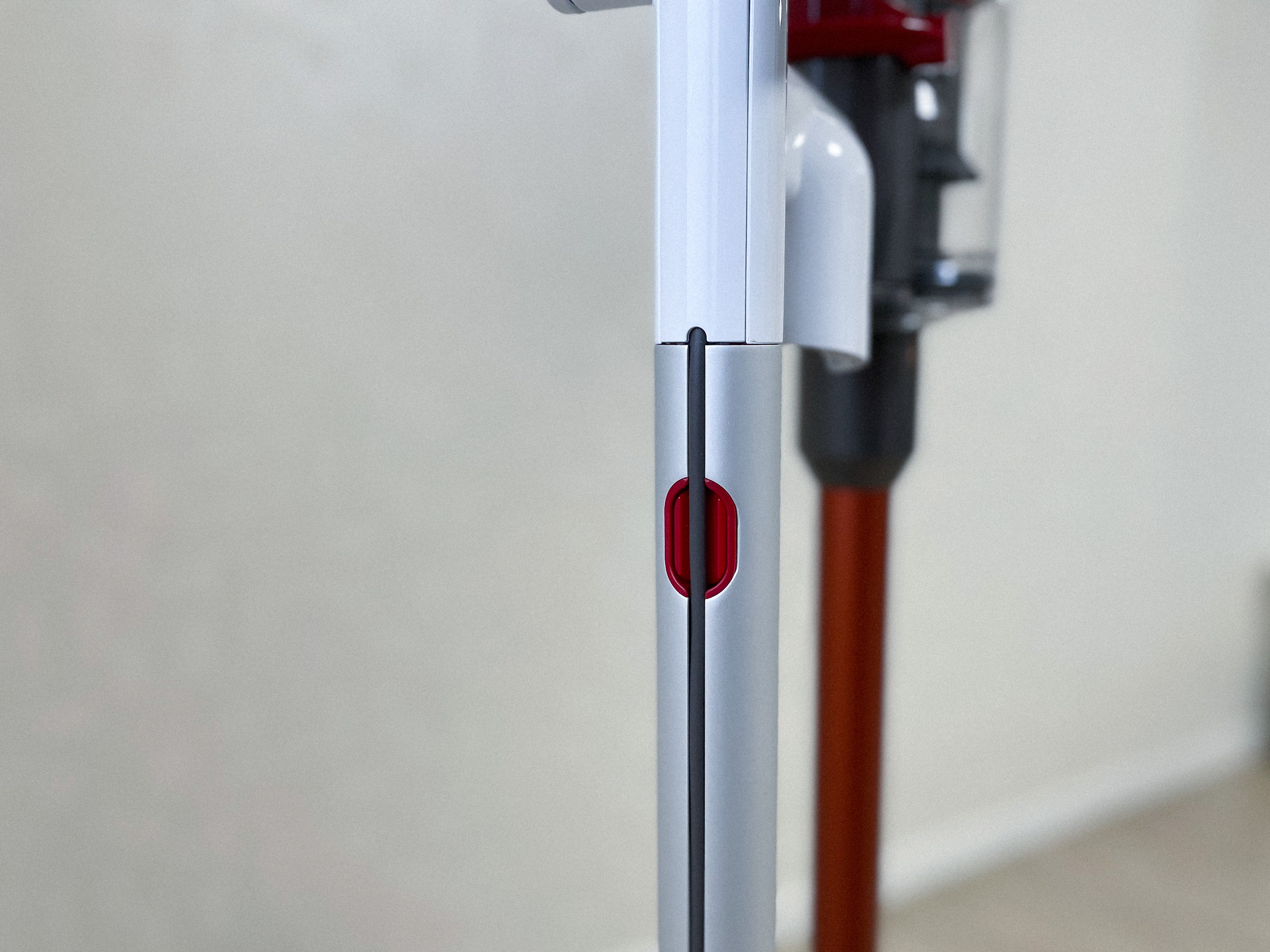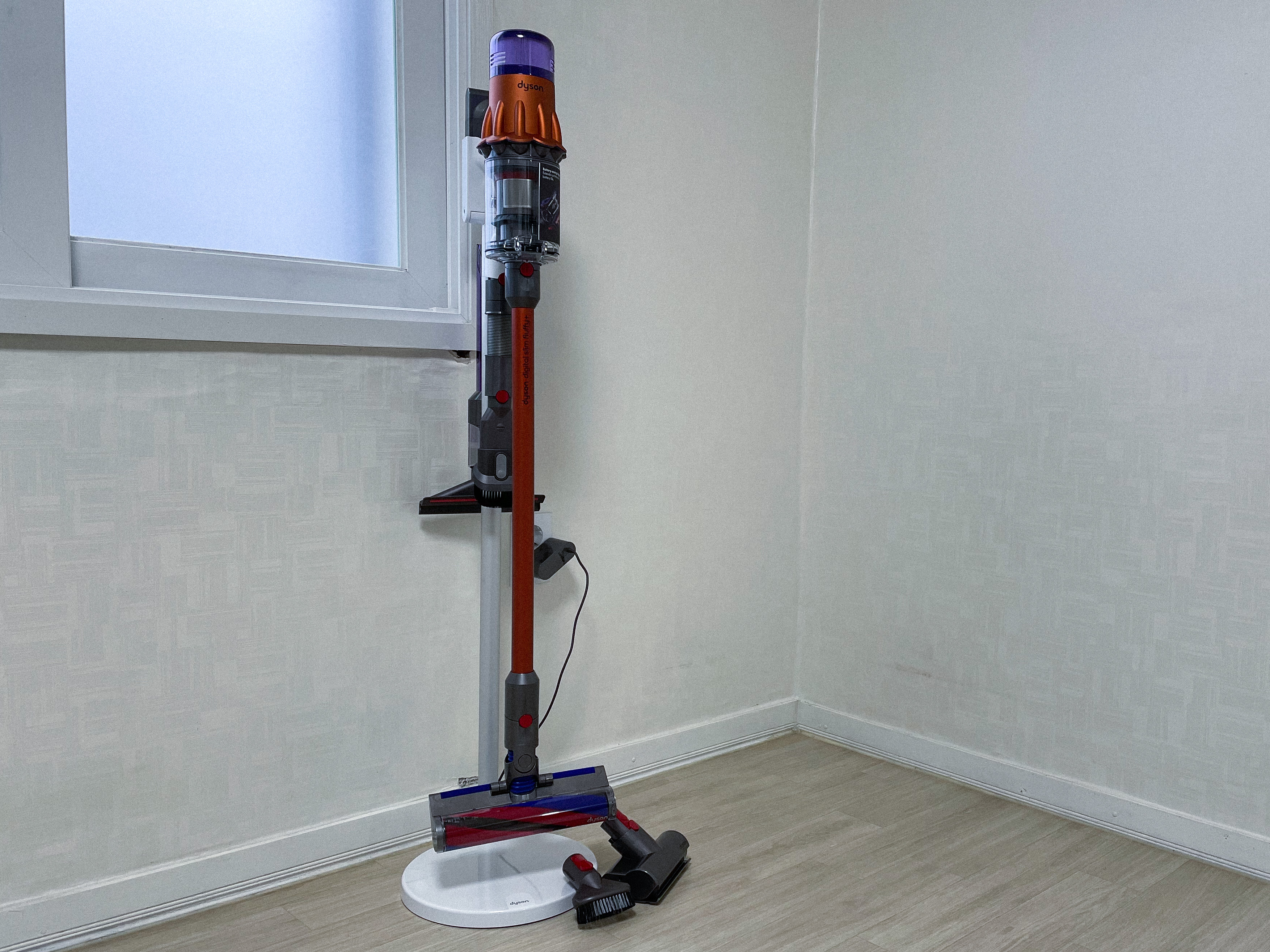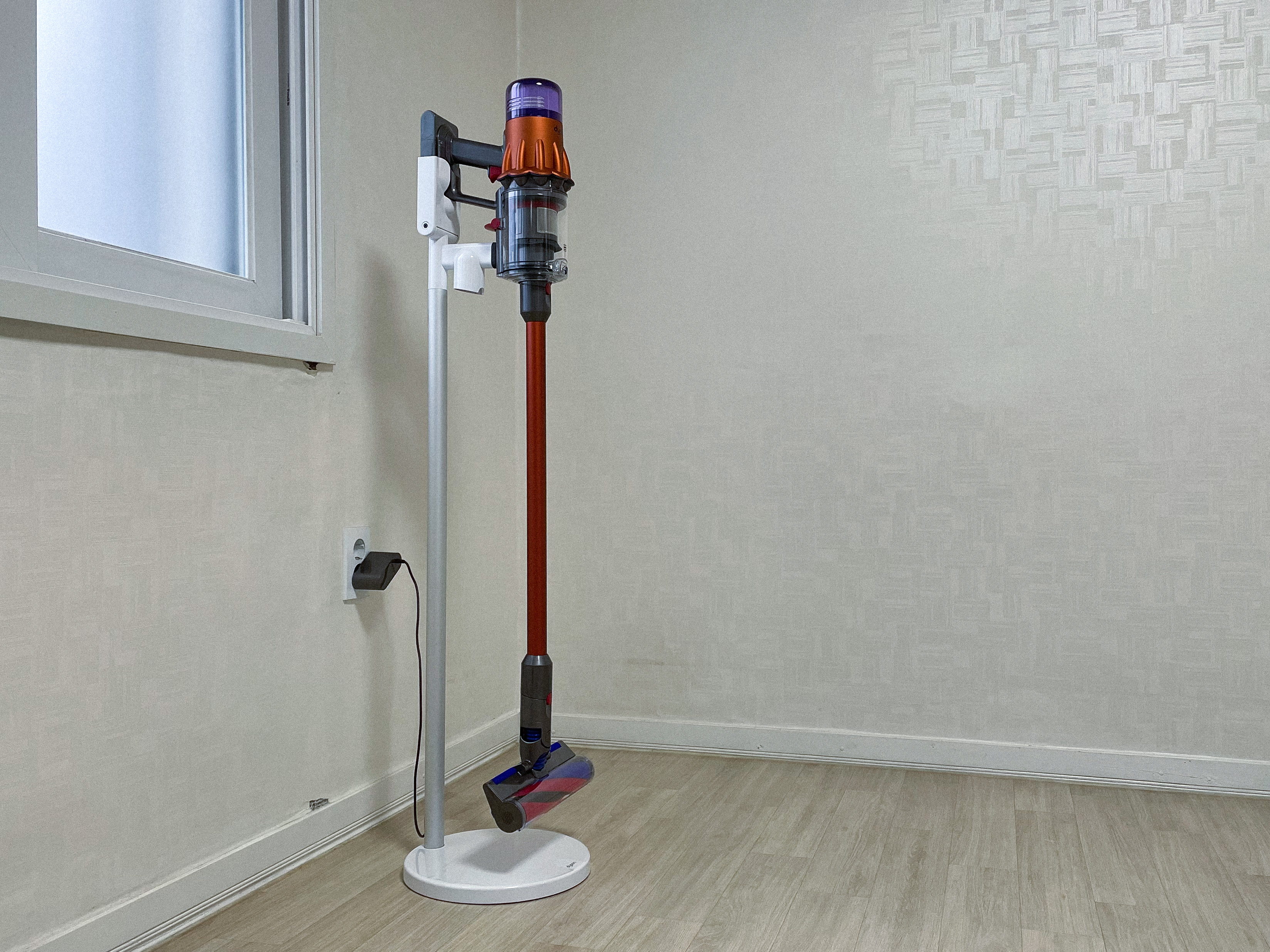 충전 선은 스탠드 뒤로 정리할 수 있습니다. 한편 디지털 슬림 플러피 플러스는 V11 대비 크기가 줄어든 덕분에 자리도 덜 차지하는데요. 전반적으로 깔끔하게 거치해 사용 가능합니다. 미니멀리즘을 선호하는 저는 이 점이 가장 마음에 들었습니다.