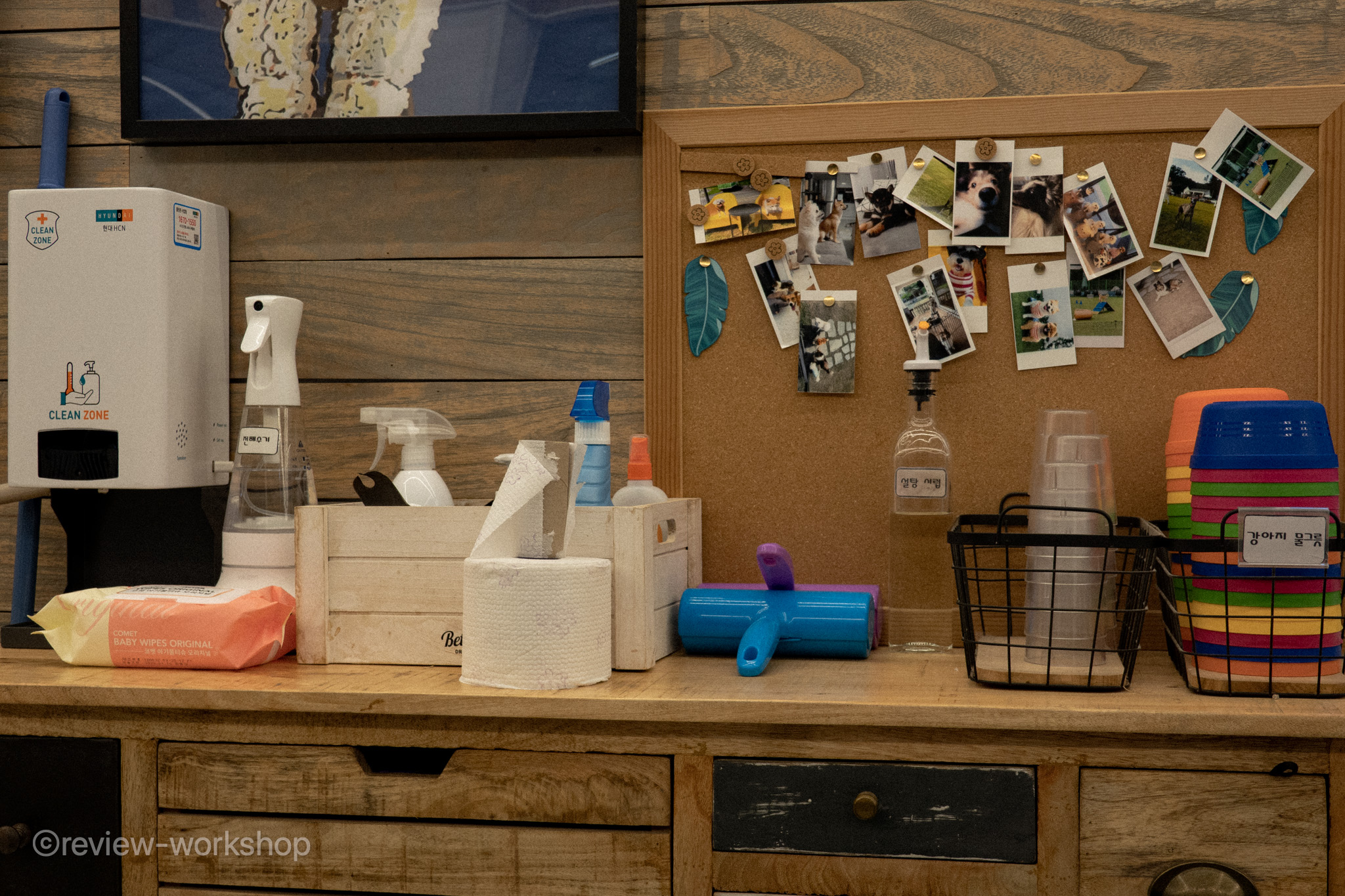 실내 인테리어는 깔끔하다. 벽면 이곳저곳에는 강아지 그림이 걸려 있는 모습이 귀엽다. 한쪽에는 견주를 위한 담요도 준비되어 있다.