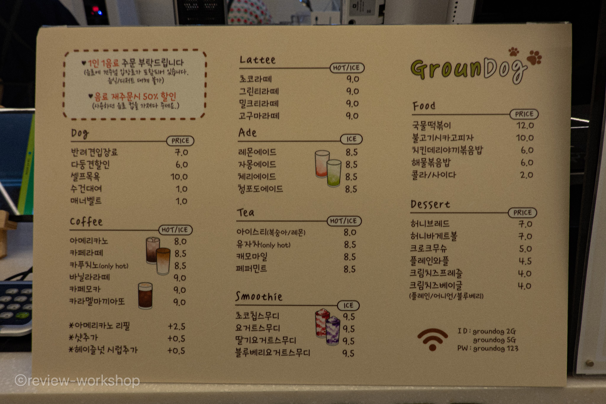 실내에는 카페가 운영 중이다. 가격은 반려견 입장료 7천 원이다. 견주 입장료는 음료에 포함됐다. 음료 가격은 여느 애견카페가 그렇듯 다소 높은 편이다. 견주 입장료가 포함되어 있으니, 그러려니 한다. 그래도 반려견, 견주 입장료를 모두 내야하고 음료도 1인 1주문 해야 하는 카페와 비교하면 저렴한 편이다.