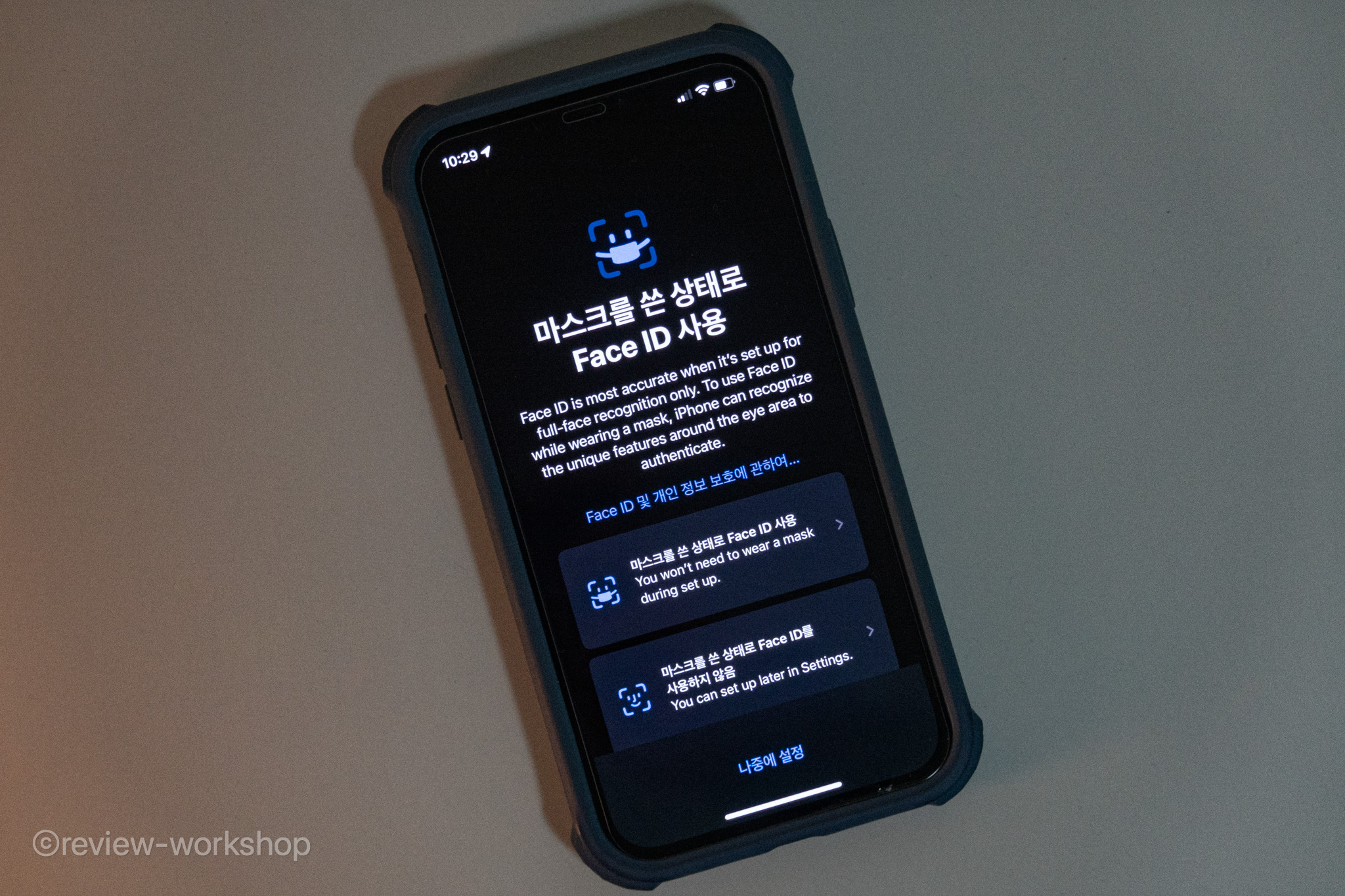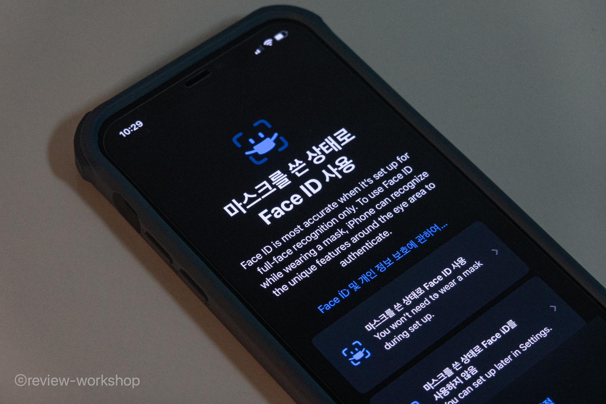 일주일 이상 사용해본 후기를 덧붙인다. '마스크 쓰고 잠금해제'는 일반 잠금해체보다 조금 느리게 반응했으며, 살짝 체감할 수 있는 수준이었다. 반박자 느린 반응이랄까? 때에 따라서는 아예 작동하지 않는 경우도 있었다. 얼굴만 슥 가져다대면 알아서 풀리는 페이스ID와 다르게, 눈 주변이라는 한정된 영역을 캐치하기에 발생하는 문제로 판단된다.