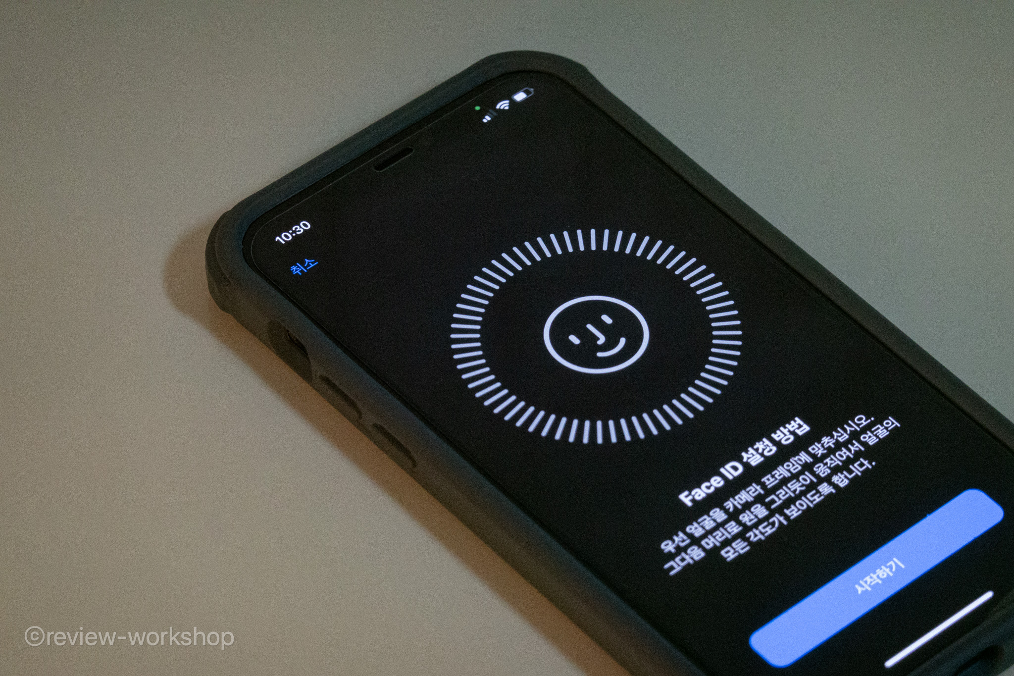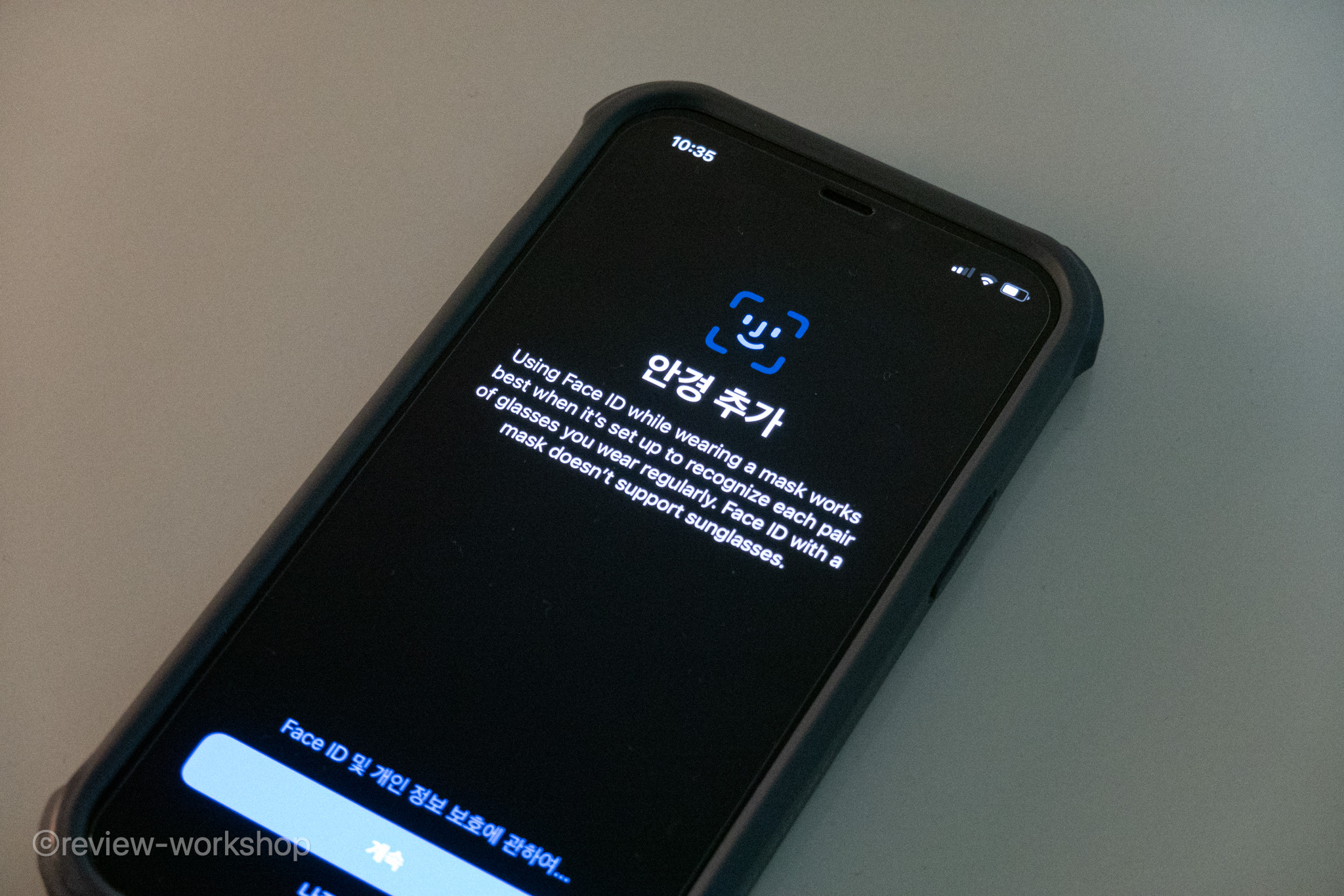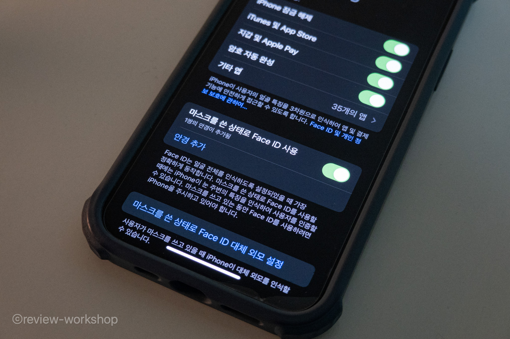 마스크 쓰고 잠금해제 기능은 설정-페이스 ID 및 암호에서 설정 가능하다. 기능을 활성화하면 페이스 ID를 처음 설정할 때 하는 얼굴 등록을 하게 된다.