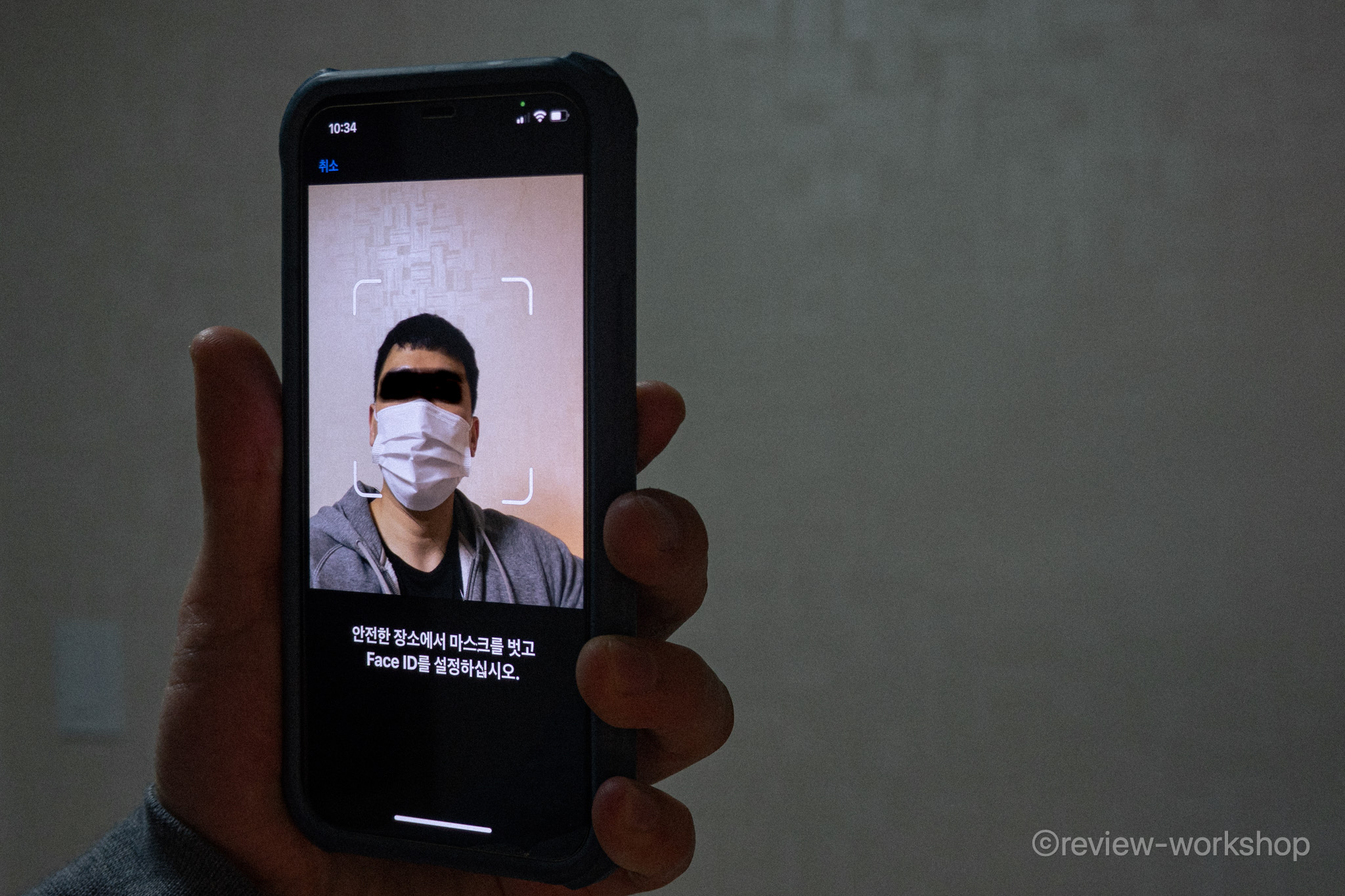 마스크 쓰고 잠금해제 기능은 설정-페이스 ID 및 암호에서 설정 가능하다. 기능을 활성화하면 페이스 ID를 처음 설정할 때 하는 얼굴 등록을 하게 된다.