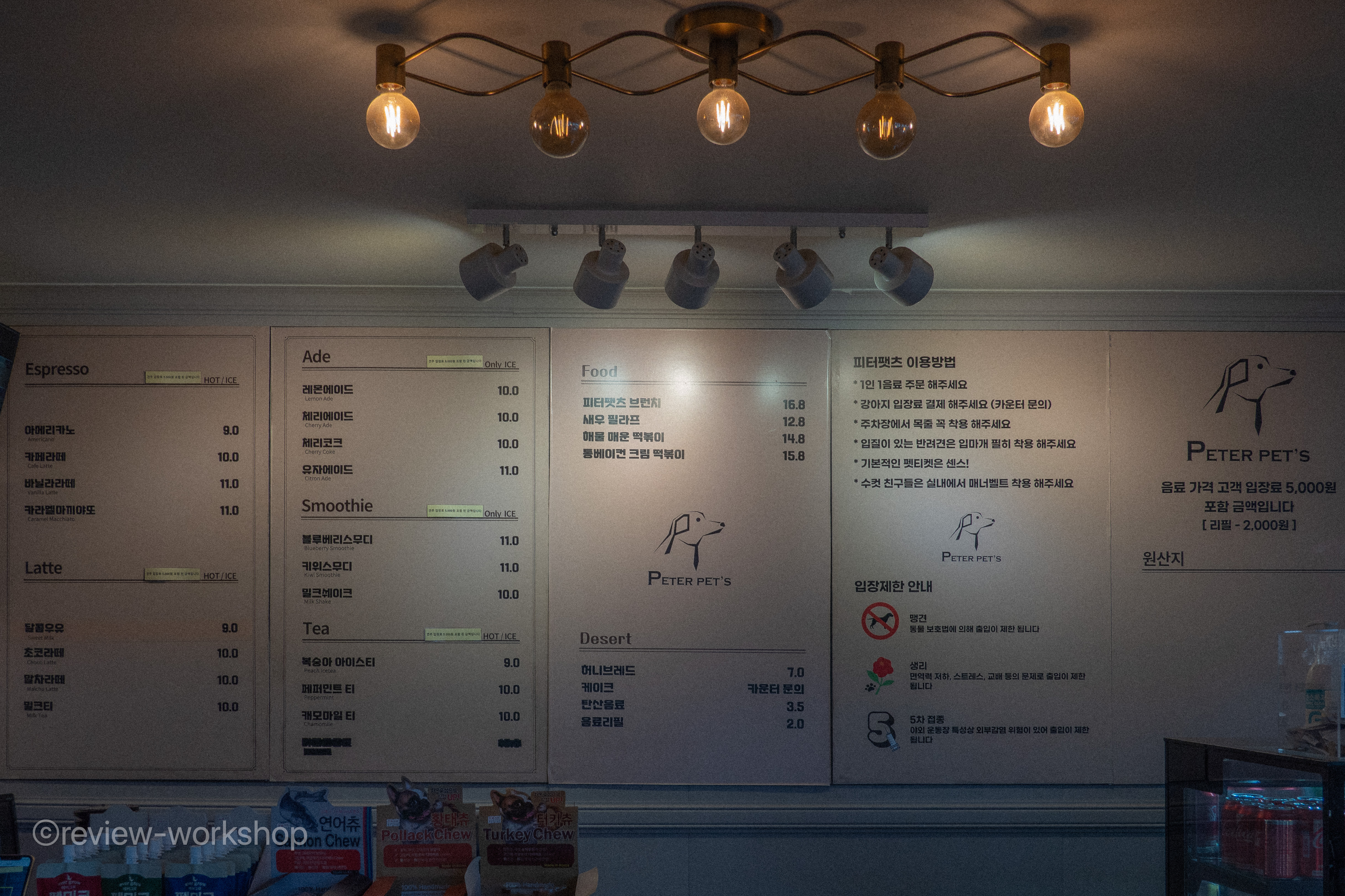 가격은 다소 높은 편이다. 견주 입장료는 음료에 포함되어 있으나 음료값이 최소 9천 원 이상. 반려견 입장료는 소형 7천 원, 중형 9천 원, 대형 1만2천 원이다. 음료 외에도 간단한 푸드와 디저트도 판매하니, 식사를 즐겨도 좋다.